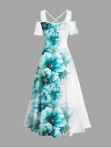 Plus Size Ombre Flowers Leaf Print Cold Shoulder Crisscross Hawaii Maxi Dress - Green - S
