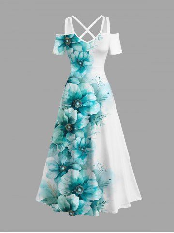 Plus Size Ombre Flowers Leaf Print Cold Shoulder Crisscross Hawaii Maxi Dress - Green - 1x