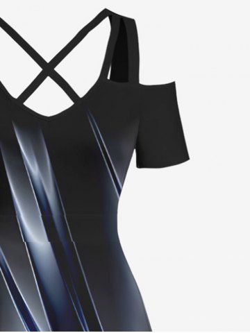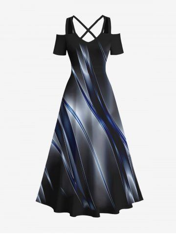 Plus Size Ombre Glitter Light Beam 3D Print Cold Shoulder Crisscross Hawaii Maxi Dress - Black - 6x