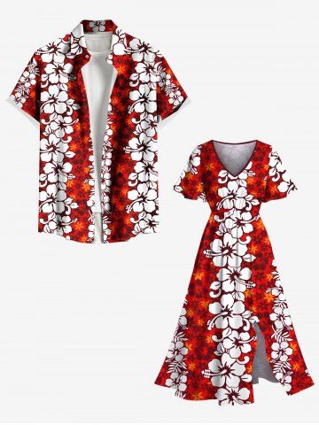 Plus Size Ombre Hibiscus Flower Print Hawaii Split Pocket A Line Midi Dress - Red - 4x