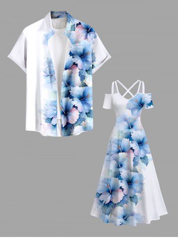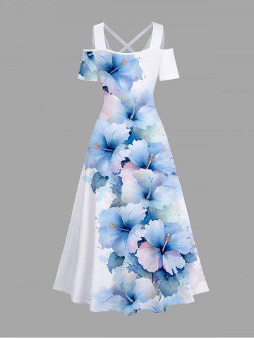 Plus Size Ombre Hibiscus Flower Print Cold Shoulder Crisscross Hawaii Maxi Dress - Blue - 1x