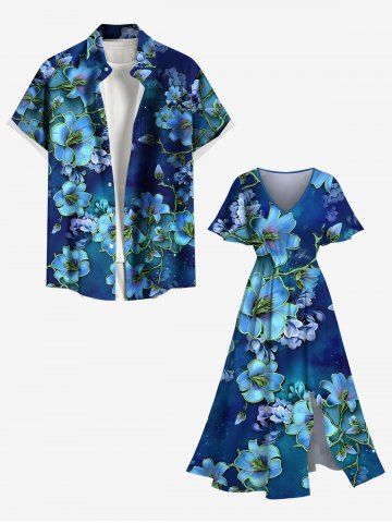 Plus Size Ombre Hibiscus Flower Print Hawaii Split Pocket A Line Midi Dress - Blue - Xxs