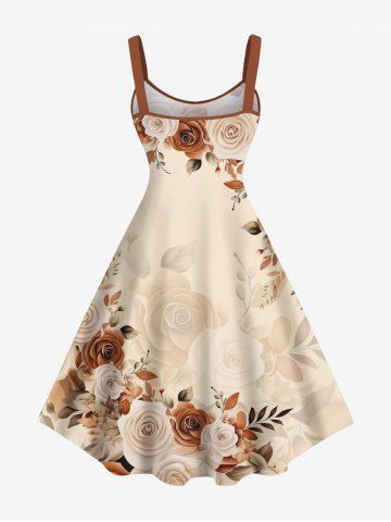 Plus Size Ombre Rose Flower Leaf Branch Print Hawaii A Line Tank Dress - Apricot - 2x