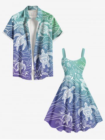 Plus Size Ombre Sea Waves Turtle Print Hawaii Tank Dress - Blue - 2x