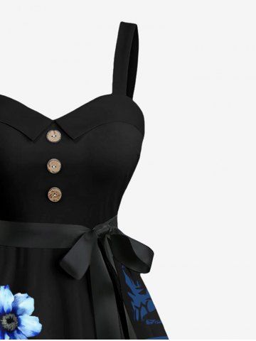 Plus Size Ombre Skull Flower Branch Print Hawaii Button Turn-down A Line Tank Dress with Removable Belt - Black - L
