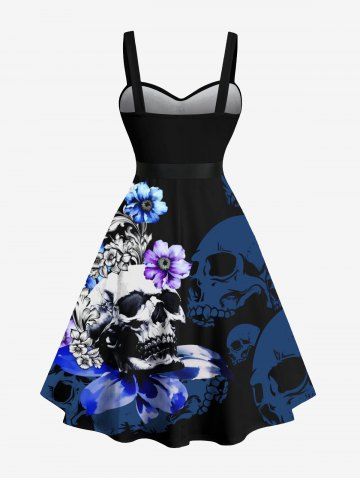 Graphic Dresses > Plus Size Ombre Skull Flower Branch Print Hawaii Button Turn-down A Line Tank Dress with Removable Belt