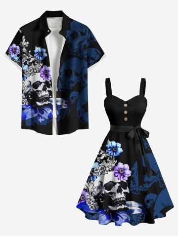 Graphic Dresses > Plus Size Ombre Skull Flower Branch Print Hawaii Button Turn-down A Line Tank Dress with Removable Belt