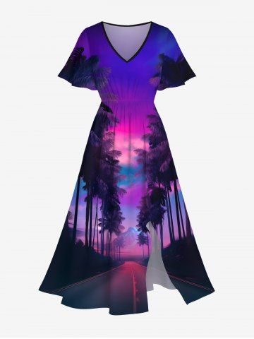 Plus Size Ombre Sky Coconut Tree Print Split Hawaii Midi Dress - Purple - 1x