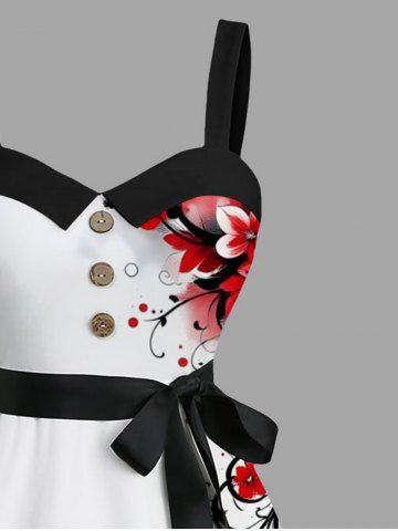 Plus Size Ombre Tie Dye Floral Branch Print Hawaii Button A Line Tank Dress with Removable Belt - White - M