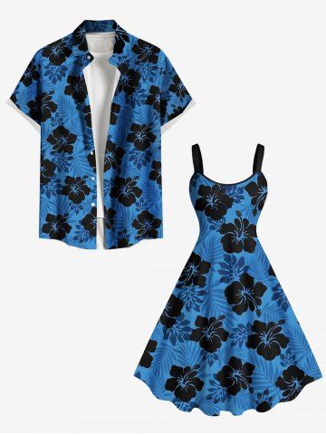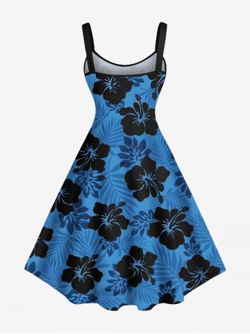 Plus Size Ombre Tropical Leaf Hibiscus Flower Print Hawaii A Line Tank Dress - Blue - L