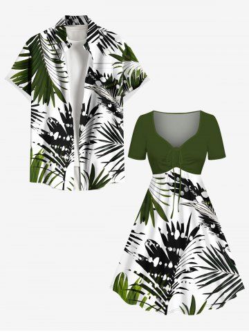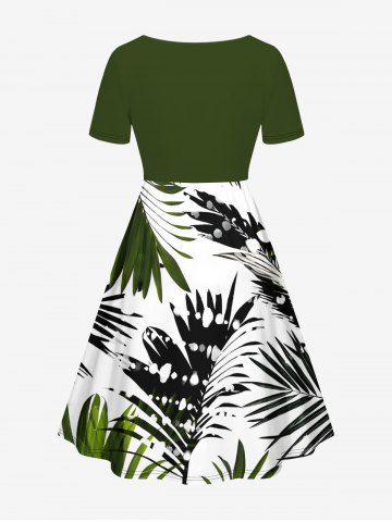 Plus Size Ombre Tropical Leaves Spotted Print Hawaii Cinched A Line Dress - Green - 6x