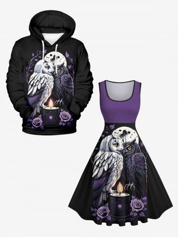 Graphic Dresses > Plus Size Owl Moon Rose Flower Candle Branch Leaf Print Halloween Costume Vintage Swing A Line Dress