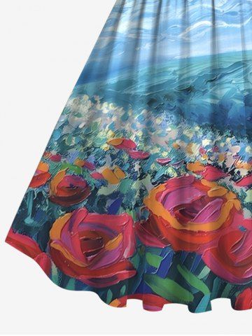 Plus Size Painting Rose Flower Sky Cloud Print Hawaii Vintage Swing A Line Dress - Sky Blue - 6x