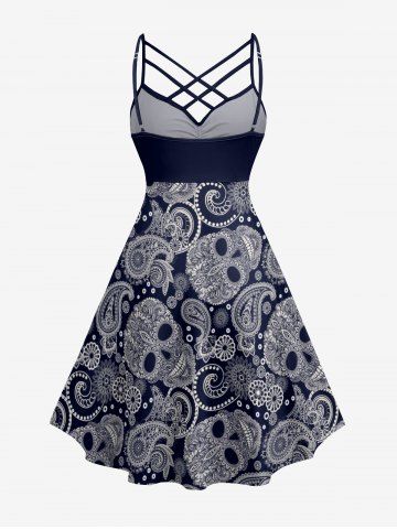 Plus Size Paisley Floral Skull Print Ruched Lattice Crisscross Straps Hawaii Dress - Deep Blue - Xxs