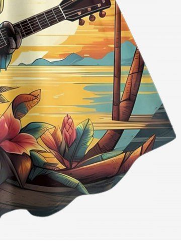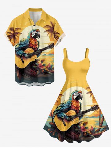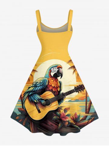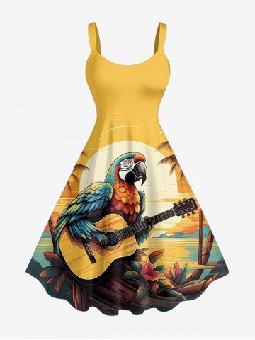 Plus Size Parrot Coconut Tree Flower Sun Seascape Print Hawaii Tank Dress - Golden Brown - 3x