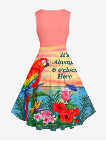 Plus Size Parrot Fruit Juice Hibiscus Flower Leaf Print Hawaii 1950s Vintage Dress - Pink - M
