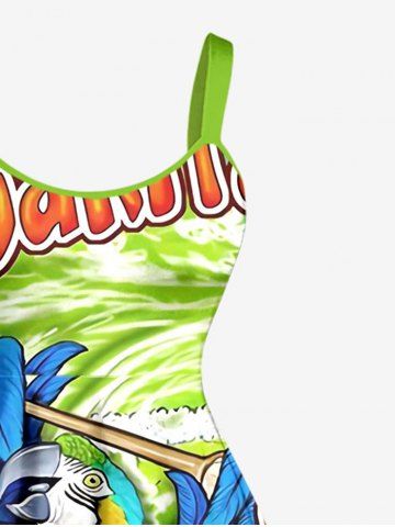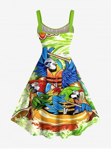 Plus Size Parrot Sea Waves Print Hawaii A Line Dress - Green - 3x