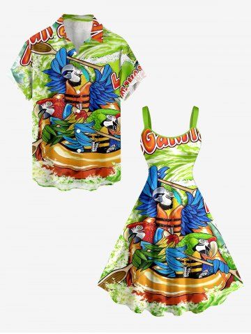 Plus Size Parrot Sea Waves Print Hawaii A Line Dress - Green - 4x