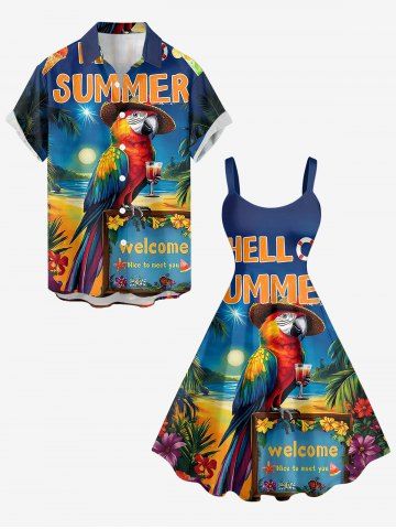 Plus Size Parrot Seascape Print Hawaii A Line Dress - Deep Blue - S