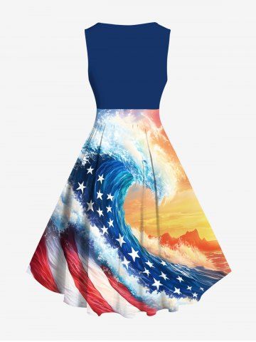 Graphic Dresses > Plus Size Patriotic American Flag Sea Waves Ombre Sky Print Hawaii 1950s Vintage Swing A Line Dress