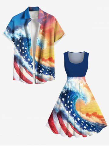 Graphic Dresses > Plus Size Patriotic American Flag Sea Waves Ombre Sky Print Hawaii 1950s Vintage Swing A Line Dress