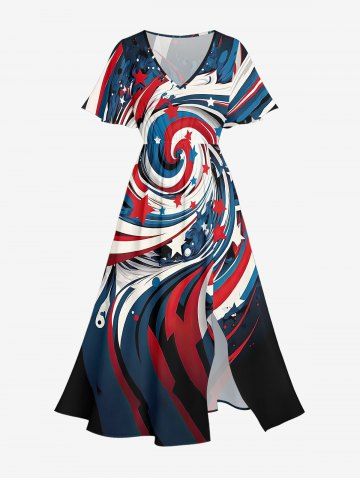 Graphic Dresses > Plus Size Patriotic American Flag Swirl Print Split Midi Dress