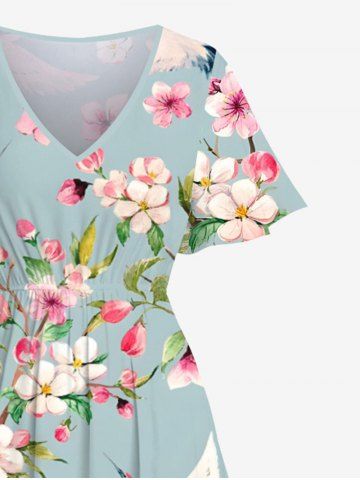 Plus Size Peach Blossom Floral Leaf Branch Crane Print Hawaii Split Pocket A Line Midi Dress - Light Blue - 4x