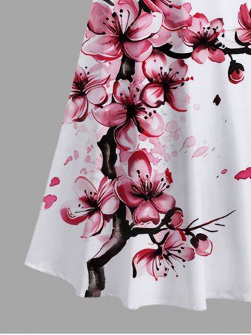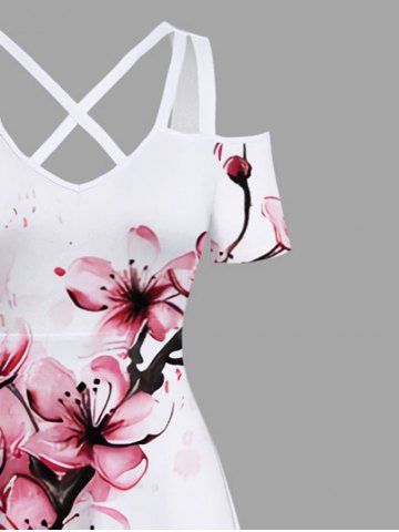 Plus Size Peach Blossom Flower Branch Print Hawaii Cold Shoulder Crisscross A Line Maxi Dress - White - Xs