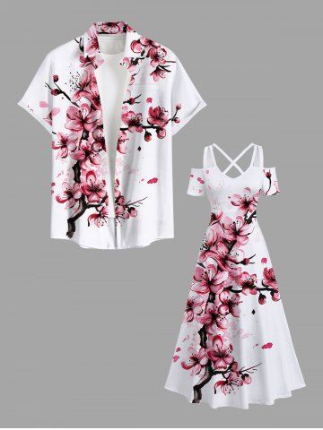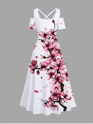 Plus Size Peach Blossom Flower Branch Print Hawaii Cold Shoulder Crisscross A Line Maxi Dress - White - 3x