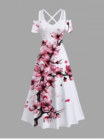 Plus Size Peach Blossom Flower Branch Print Hawaii Cold Shoulder Crisscross A Line Maxi Dress - White - 4x