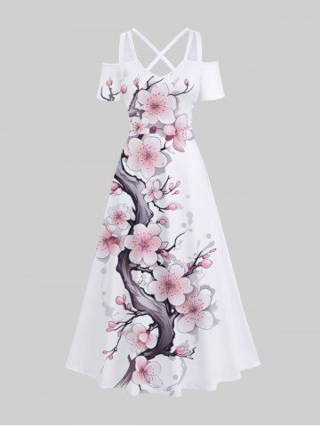 Plus Size Peach Blossom Flower Print Cold Shoulder Crisscross Hawaii Maxi Dress - White - Xs