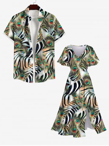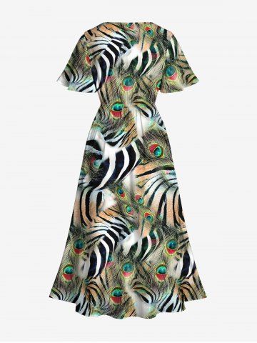 Hawaii Plus Size Peacock Feather Tiger Zebra Striped Print Split Pocket A Line Dress - Green - L