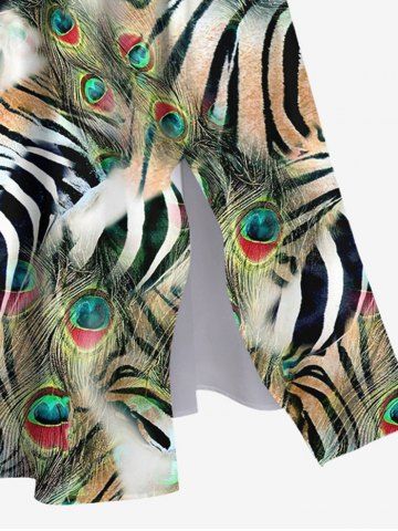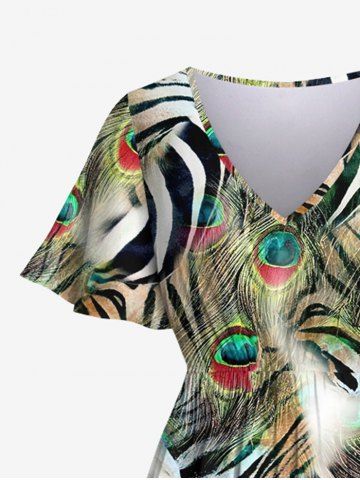 Hawaii Plus Size Peacock Feather Tiger Zebra Striped Print Split Pocket A Line Dress - Green - 5x