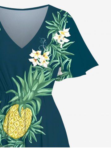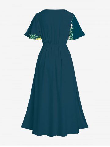 Plus Size Pineapple Floral Tropical Leaves Print Hawaii Split Pocket A Line Midi Dress - Green - S