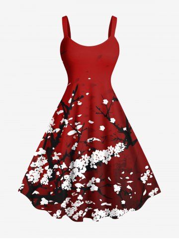 Plus Size Plum Bossom Flower Print Hawaii Tank Dress - Red - M