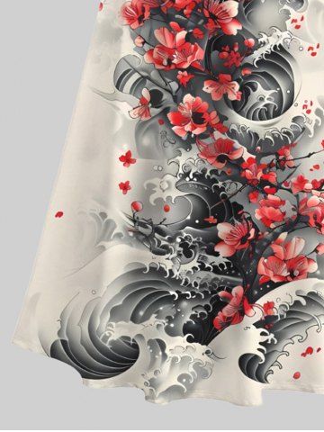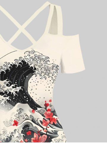 Graphic Dresses > Plus Size Plum Bossom Flower Sea Waves Print Cold Shoulder Crisscross Hawaii Maxi Dress