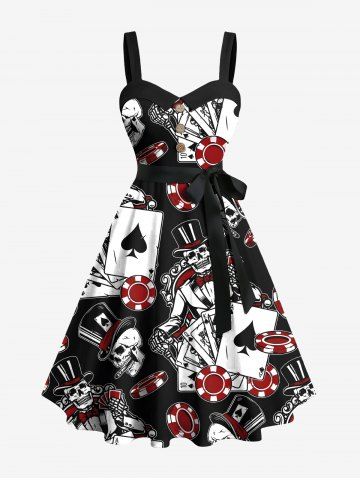 Plus Size Poker Casino Chips Skull Print Buttons Turn Down Collar Hawaii Dress With Belt - Black - 4x