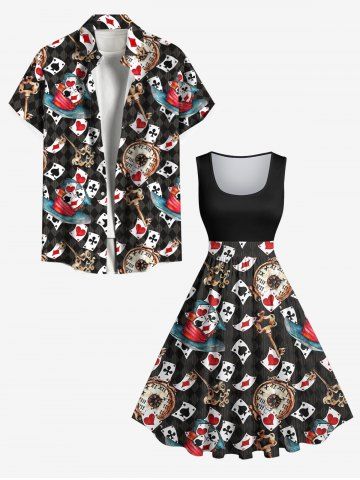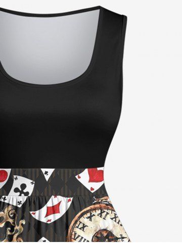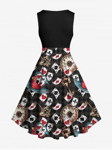 Plus Size Poker Key Clock Print Vintage Swing A Line Dress - Black - 1x