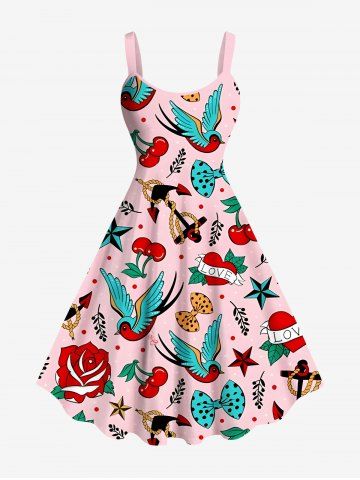Plus Size Rose Flower Bird Cherry Bowknot Heart Anchor Print Hawaii A Line Tank Dress - Light Pink - M
