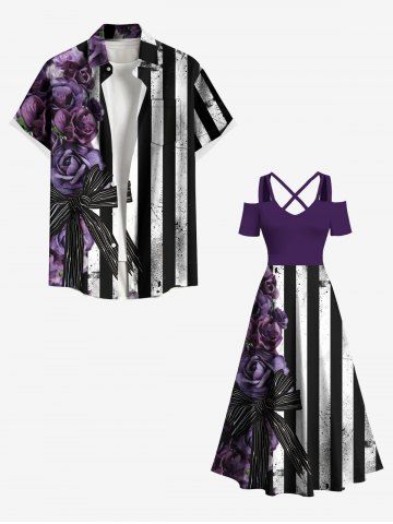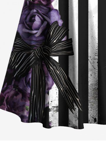 Plus Size Rose Flower Bowknot Ink Painting Zebra Striped Print Hawaii Cold Shoulder Crisscross A Line Maxi Dress - Purple - Xs