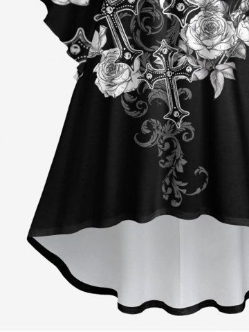 Plus Size Rose Flower Branch Cross Butterfly Print Ruched High Low Asymmetric Dress - Black - M