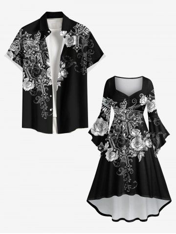 Graphic Dresses > Plus Size Rose Flower Branch Cross Butterfly Print Ruched High Low Asymmetric Dress