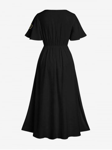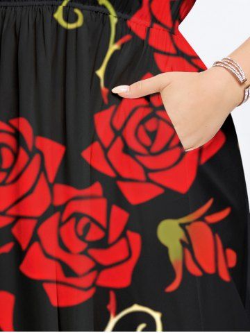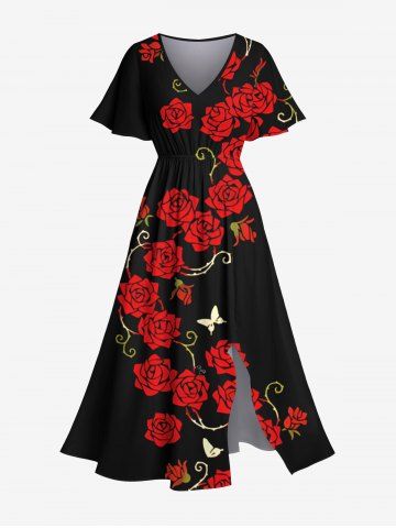 Plus Size Rose Flower Butterfly Branch Print Valentines Split Pocket A Line Midi Dress - Black - L