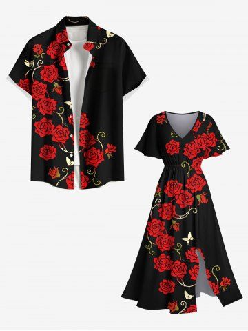 Plus Size Rose Flower Butterfly Branch Print Valentines Split Pocket A Line Midi Dress - Black - 4x