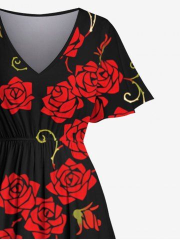 Plus Size Rose Flower Butterfly Branch Print Valentines Split Pocket A Line Midi Dress - Black - 5x