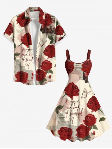 Plus Size Rose Flower Butterfly Letter Newspaper Print Hawaii Ombre A Line Tank Dress - Red - 3x