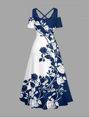 Plus Size Rose Flower Colorblock Print Cold Shoulder Crisscross Hawaii Maxi Dress - Deep Blue - Xxs