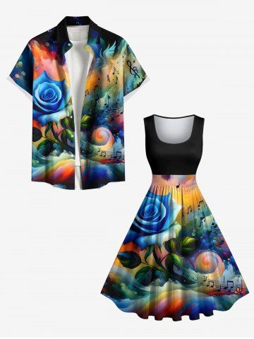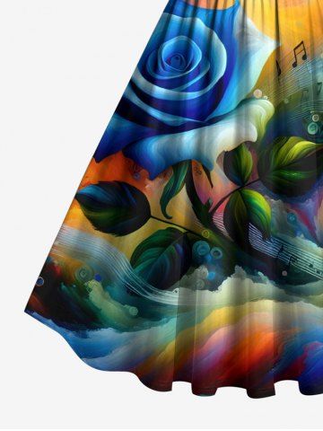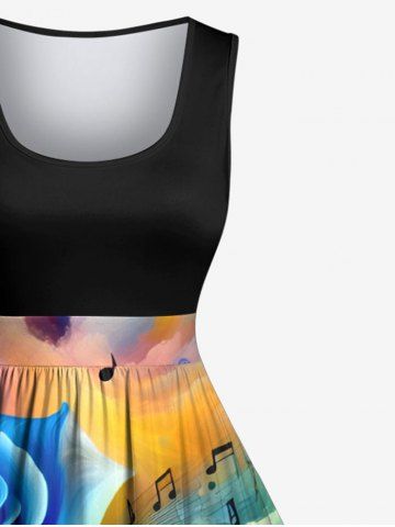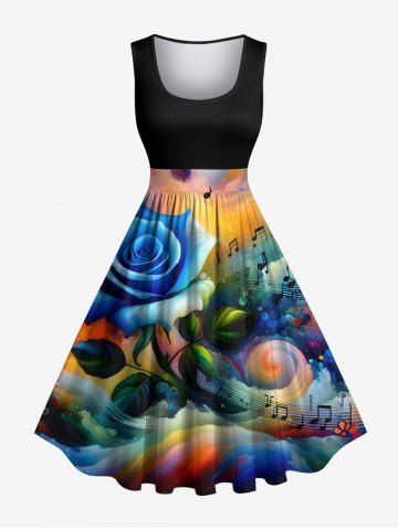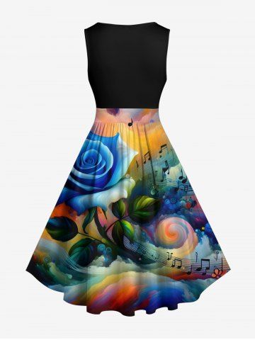 Plus Size Rose Flower Colorful Ombre Cloud Music Symbol Print Hawaii Valentines Vintage Swing A Line Dress - Black - 5x
