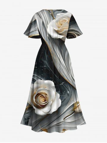 Graphic Dresses > Plus Size Rose Flower Curve Galaxy Print Hawaii Split Pocket A Line Midi Dress