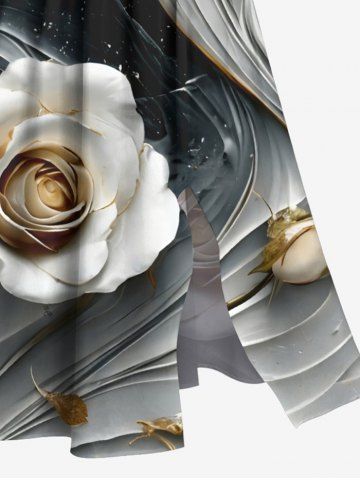 Plus Size Rose Flower Curve Galaxy Print Hawaii Split Pocket A Line Midi Dress - Black - 2x